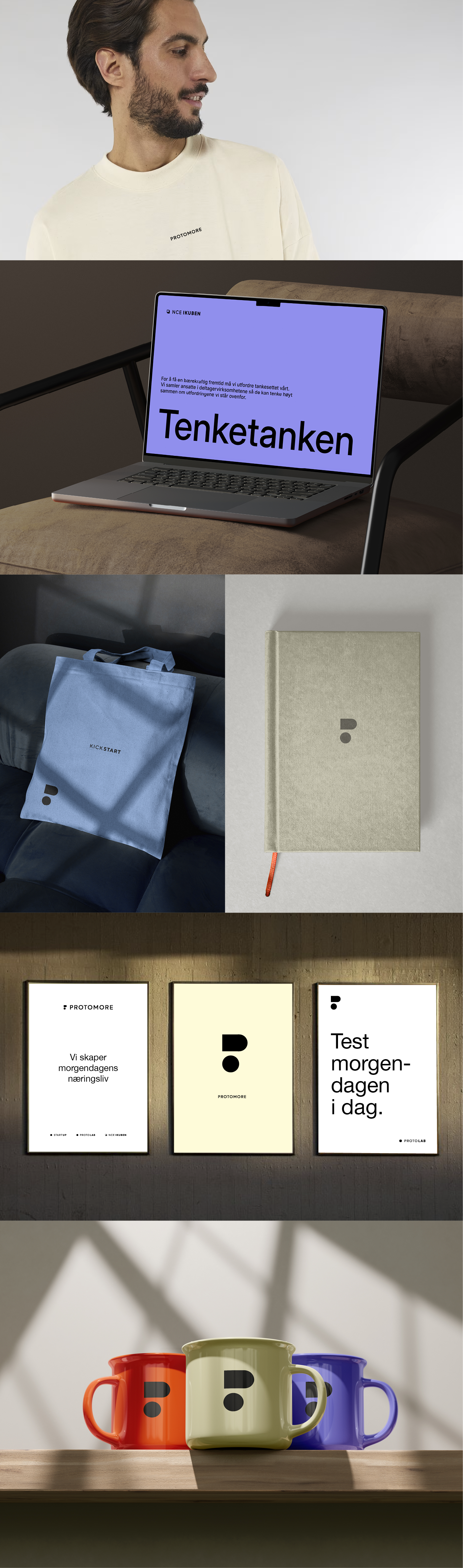 Fargene er valgt for å samle hele Protomore-universet – og samtidig gi hver del sin egen personlighet. Paletten skal kjennes energisk, leken og profesjonell på samme tid. Gul binder alt sammen. De andre fargene gir liv til tjenestene rundt.